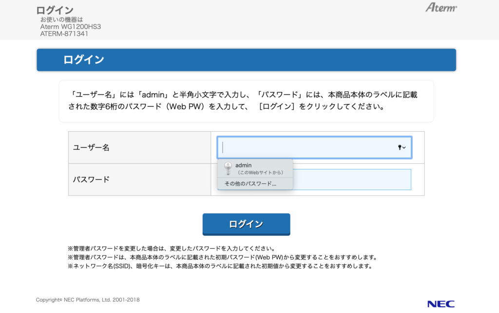 設定したrouterは、WG1200HS3というNECのルーターです。以下手順になります。