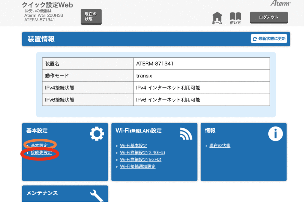ログイン後の画面です。まずは、オレンジで囲った「基本設定」をして、次に赤で囲った「接続先設定」をいじって、その後再起動をかけるという順番です。で、まず「基本設定」をクリック。