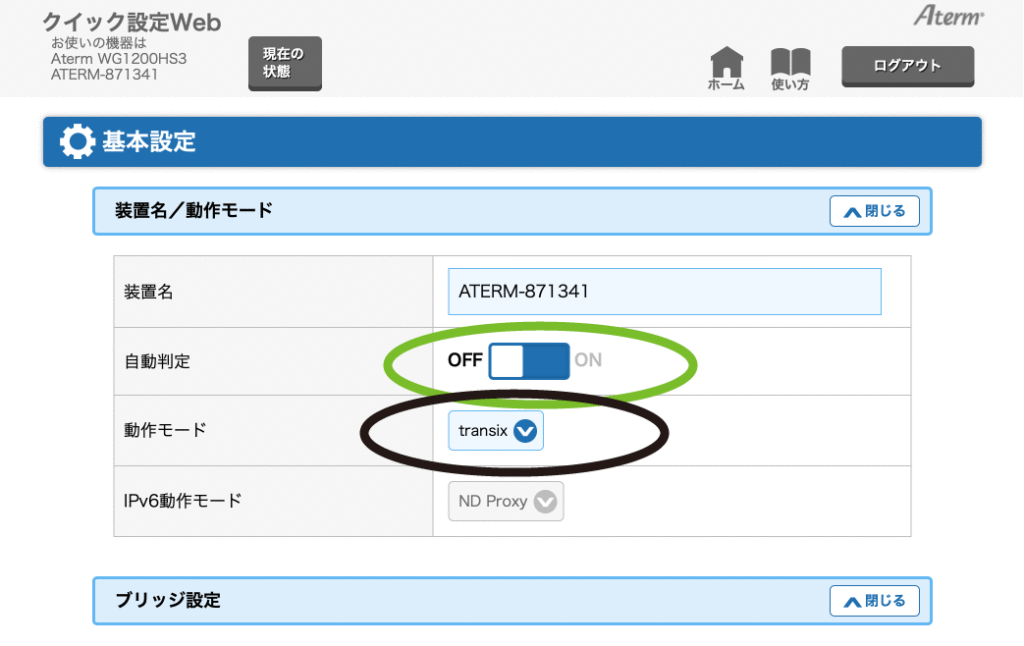 で、「基本設定」画面にて、緑丸で囲った「自動判定」をOFFして、黒丸で囲った「動作モード」をtransixにして、最後に黒丸で囲った「設定」をクリックして終了。