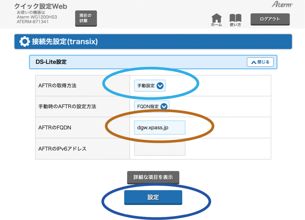 で、接続先設定の画面で、水色の丸「AFTRの取得方法」を「手動設定」にして、茶色の丸「AFTRのFQDN」に、「dgw.xpass.jp」と打ち込んで、最後に青丸の「設定」をクリック。