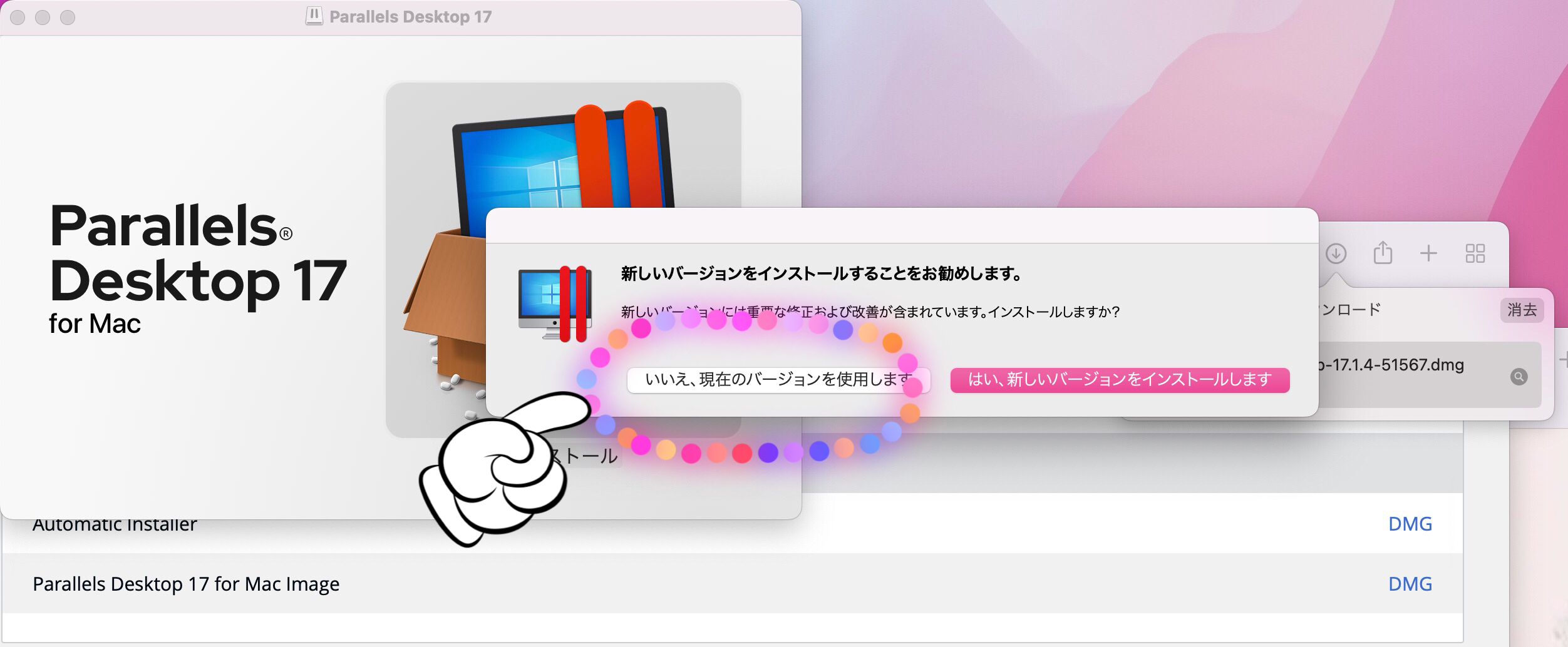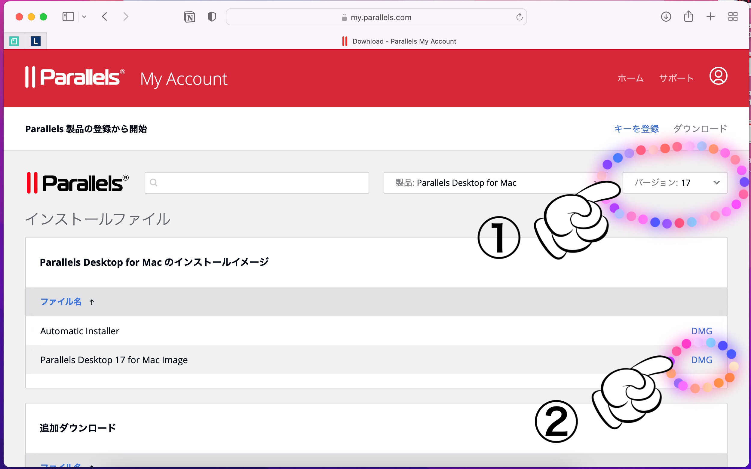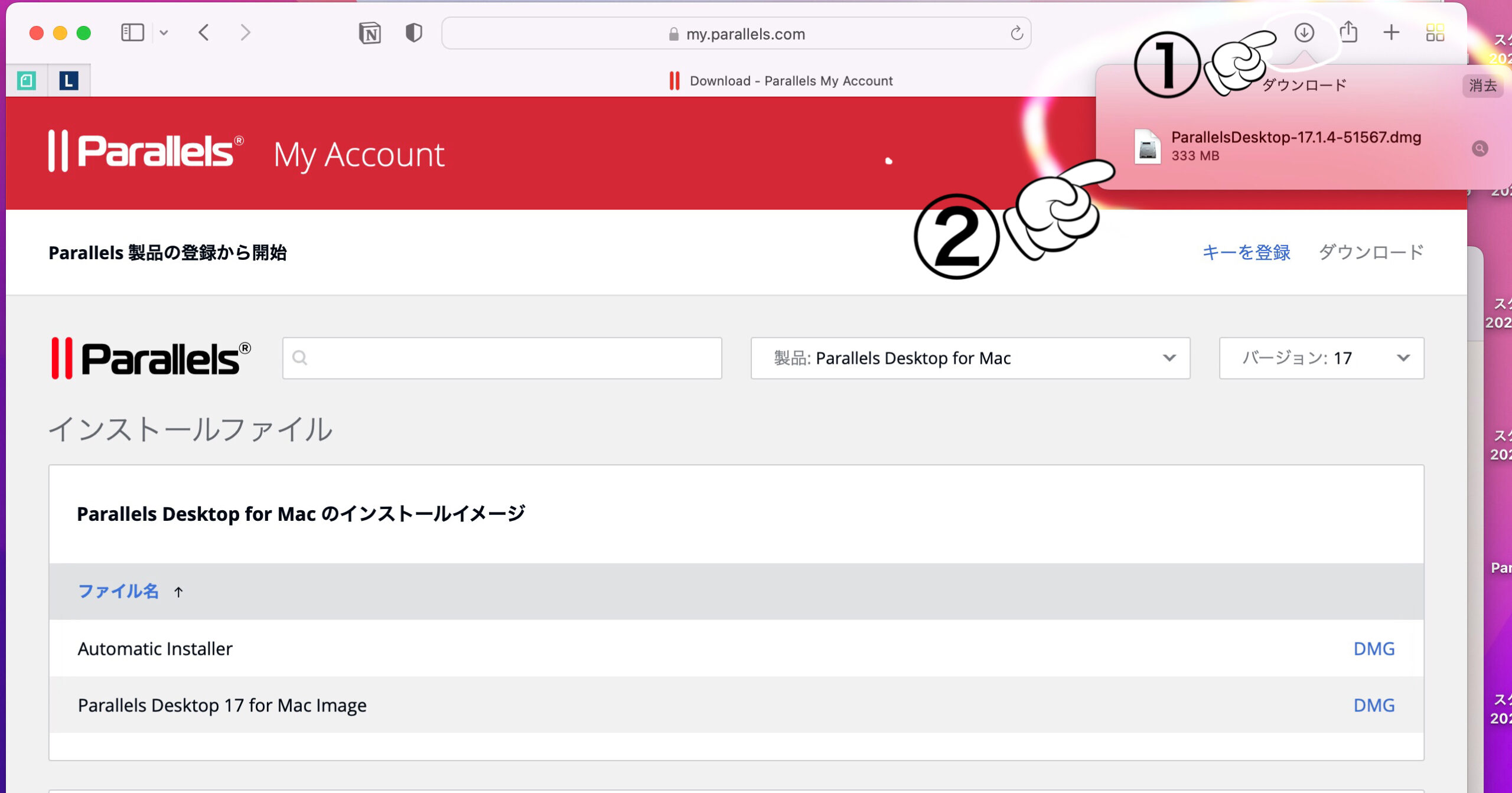 Parallels Desktop17の場合は、 ①「バージョン17」を選択して、 ②Parallels Desktop 17 for Mac Image の 「DMG」をクリックしてダウンロードします。 一つ上のAutomatic Installerだと最新の18がダウンロードされてしまうこともあるようですのでおすすめしません。