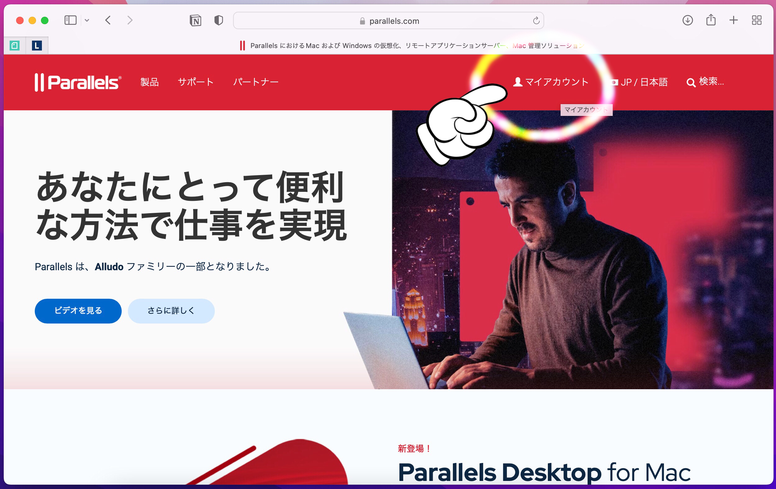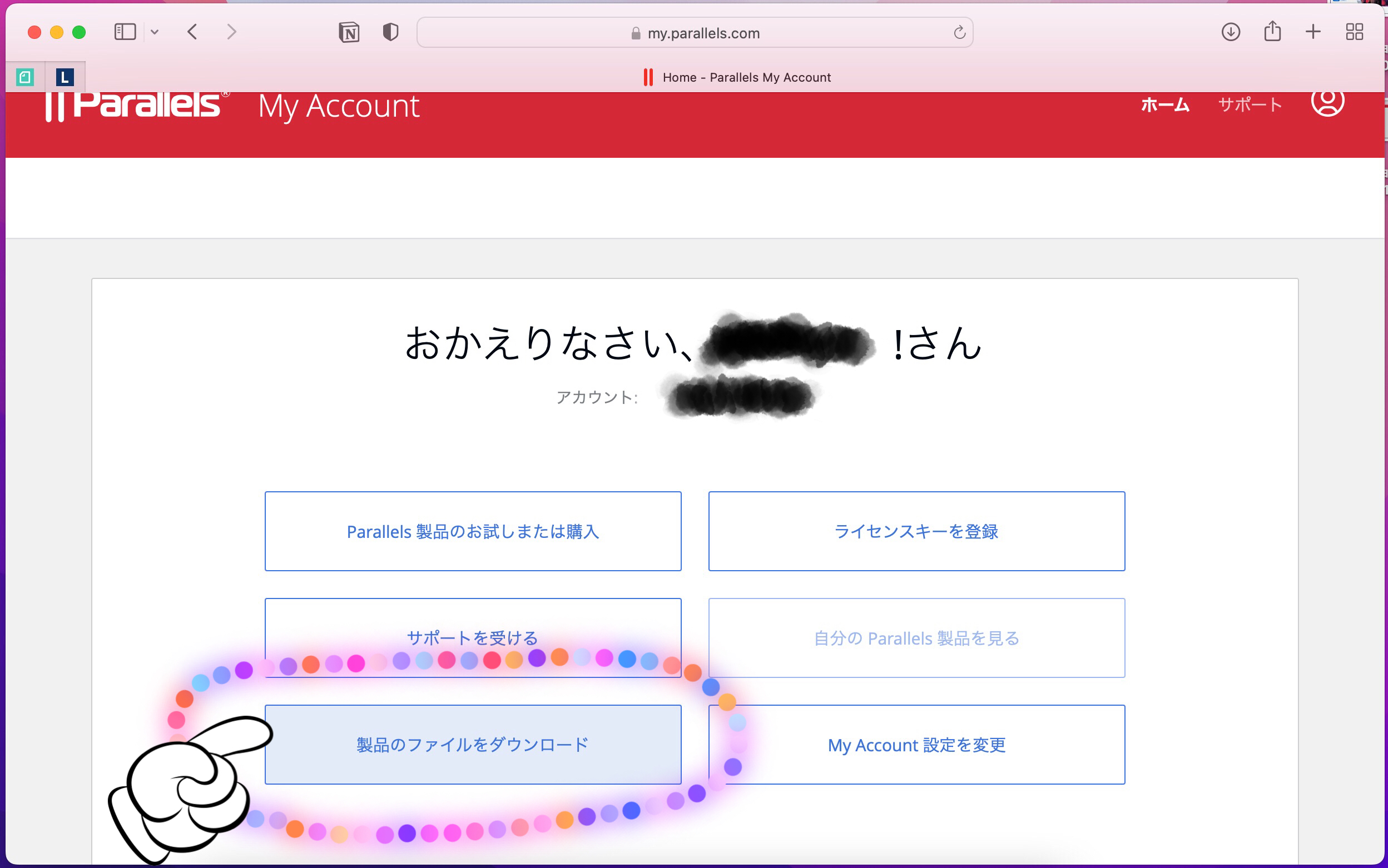 まずは、パラレルズのホームページにアクセスして、マイアカウントにログインします。