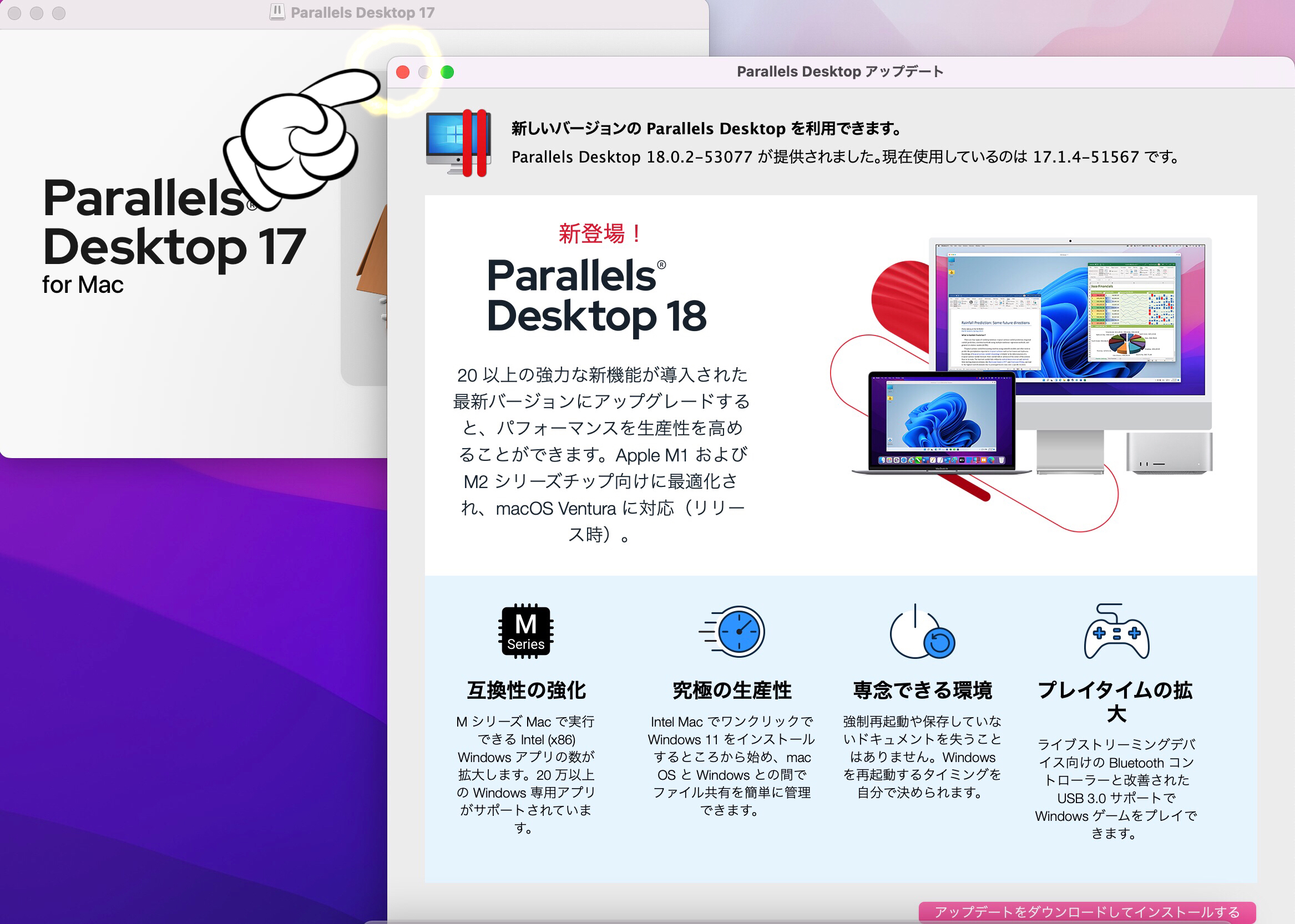 途中で、新しいバージョンをインストールしますか?と聞かれますが、ここでは「いいえ」を選択してください。「はい」を選択すると、最新のParallels Desktop18がダウンロードされて追加料金を支払う方向に持っていかれるので気を付けてください。