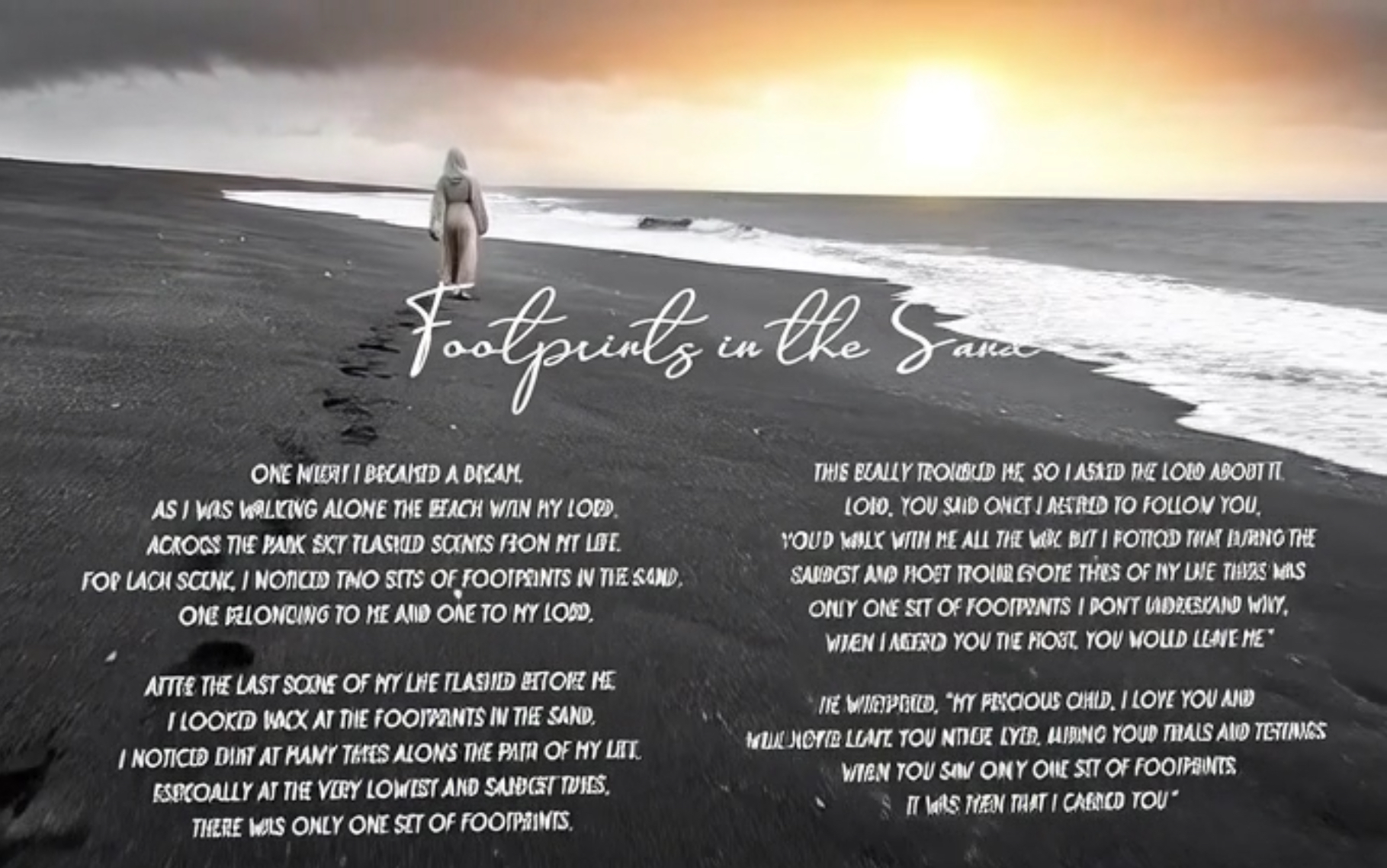 One night I dreamed a dream. As I was walking along the beach with my Lord. Across the dark sky flashed scenes from my life. For each scene, I noticed two sets of footprints in the sand, One belonging to me and one to my Lord.